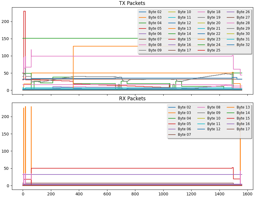 Identifying the data itself is a new challenge. I started by graphing every byte position as a line over the packet index and looked for visual patterns. A flat line means a constant. A noisy line might be a counter, a measurement, or a checksum. Spikes might correlate with events. The human eye is surprisingly good at spotting structure in this kind of visualization.