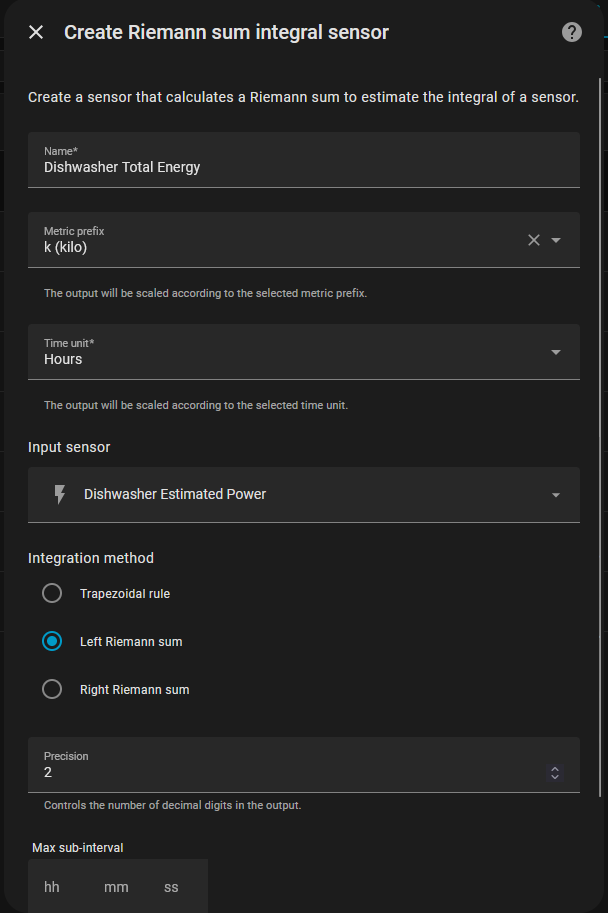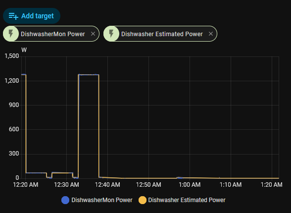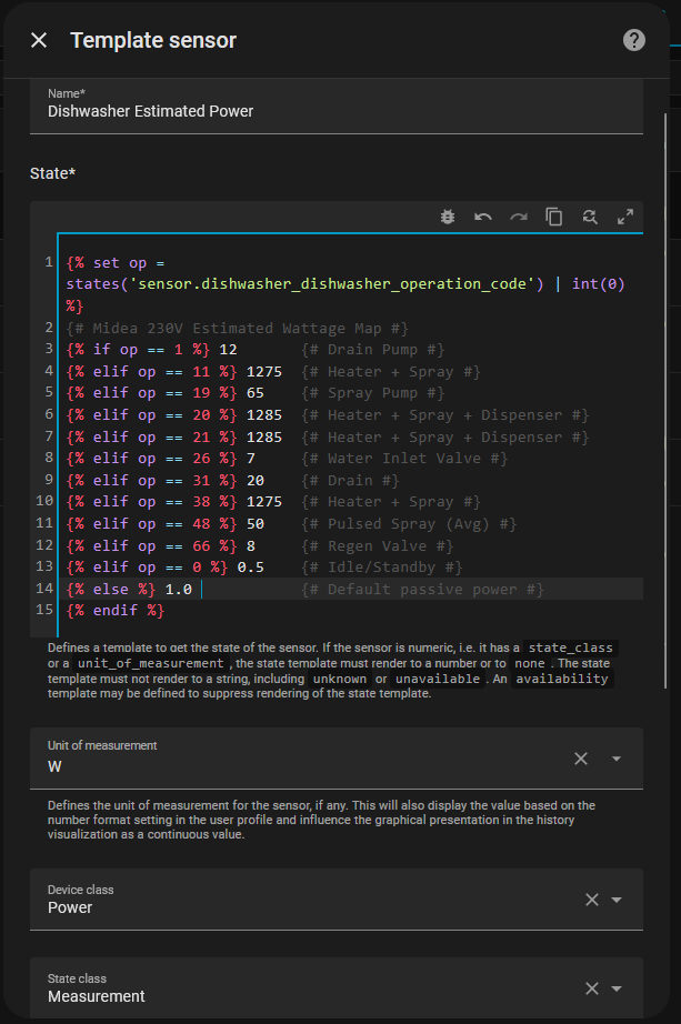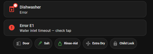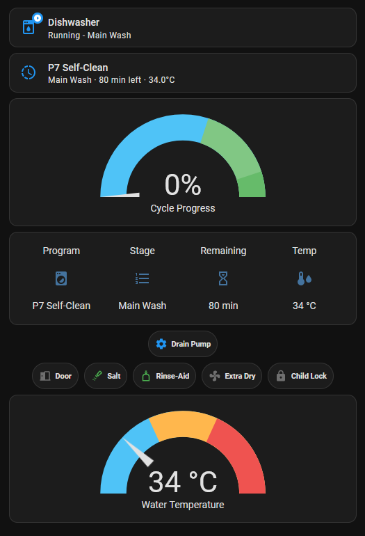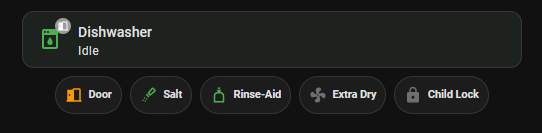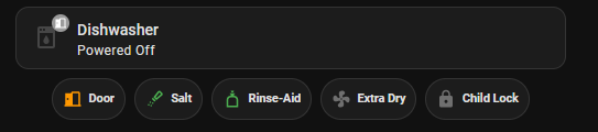 In the end, I created a small home assistant dashboard card to show all the information I want, the code is included in the esphome-midea-dishwasher repo linked above. For a fun test, I created a virtual power sensor using a Home Assistant helper and also added a total energy tracker to test my virtual power monitoring hypotheses. I only ran one cycle so far, but it seems that the energy trackers is on just a little over the real power measured from the energy monitoring plug (0.18 vs 0.19 Kwh for a Rapid program).