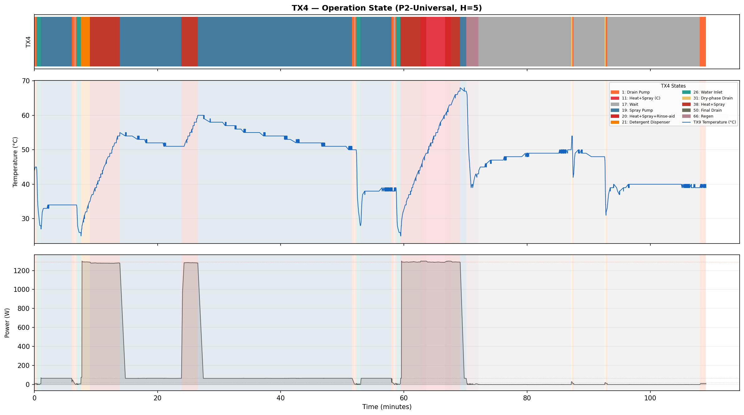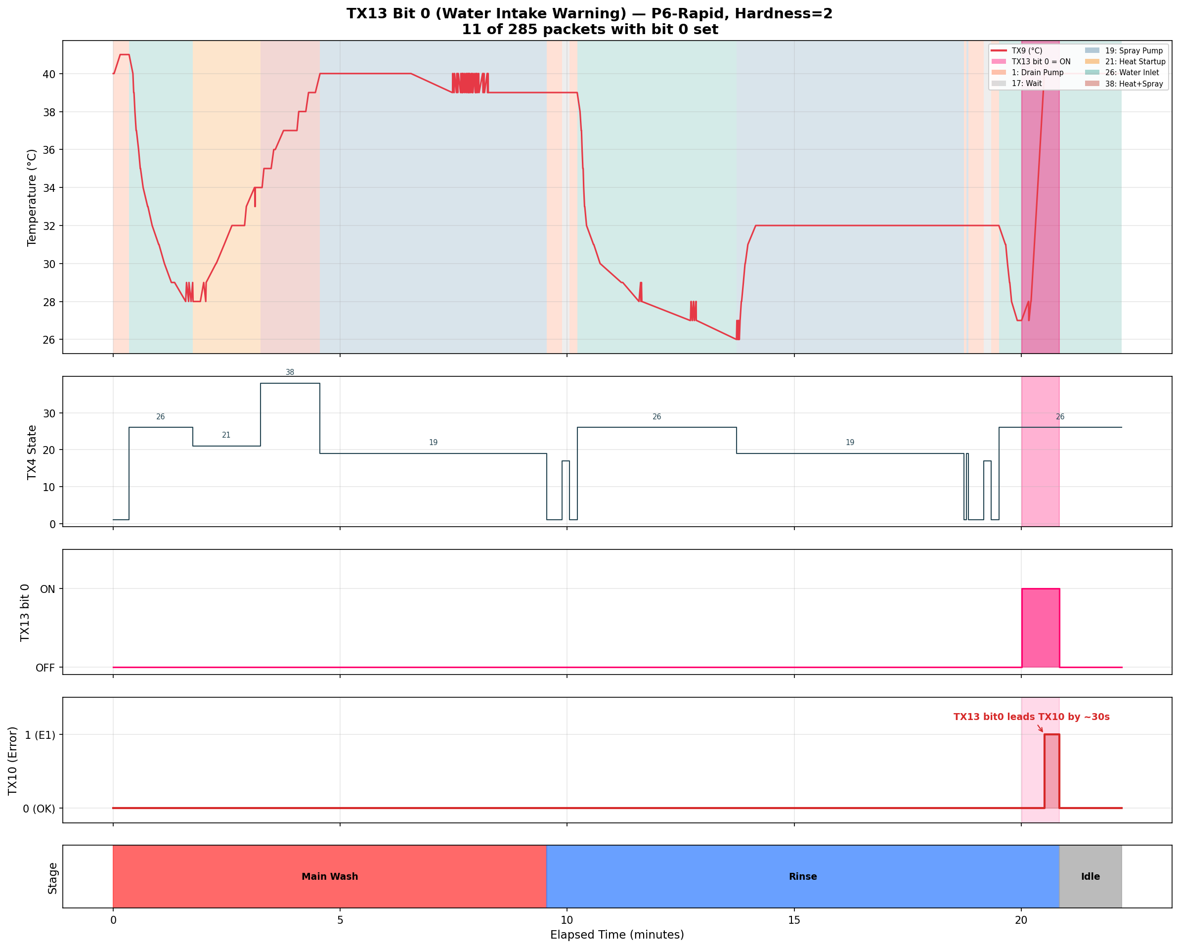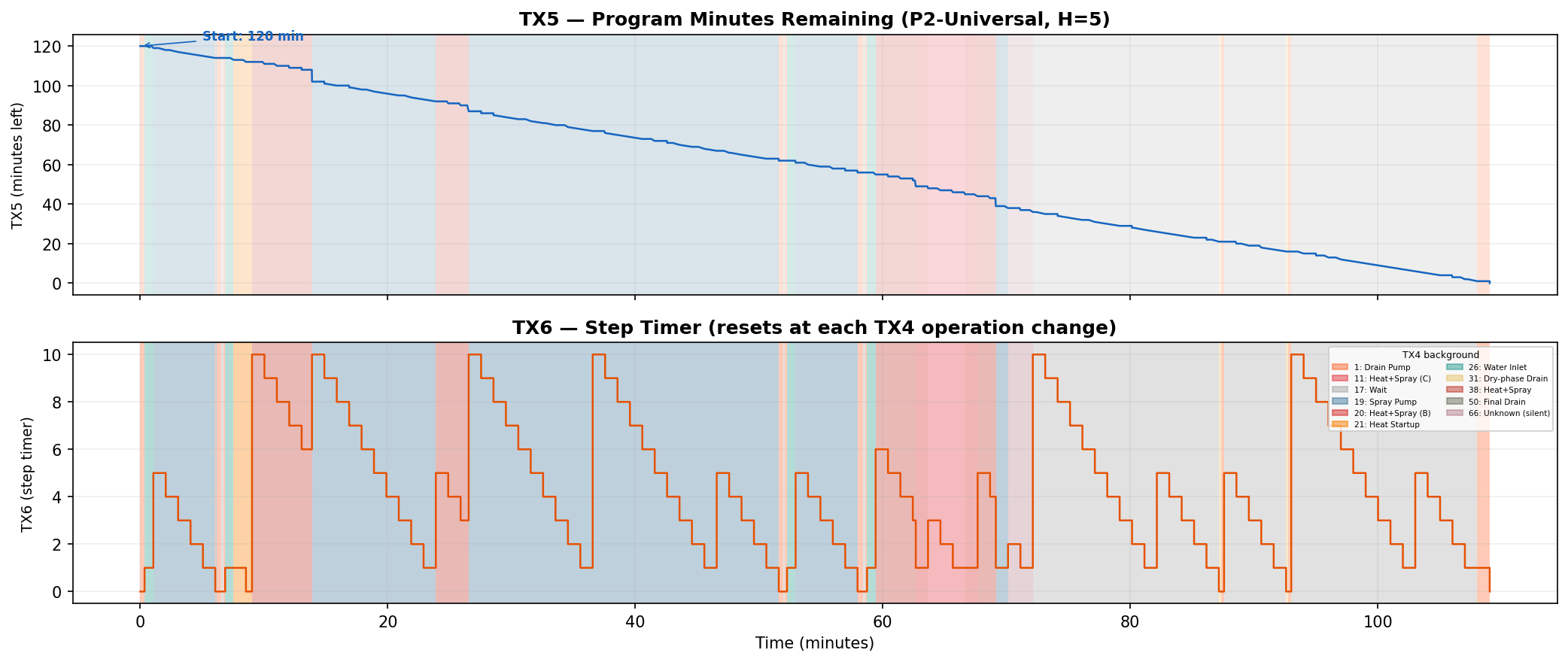 TX4 was the hardest byte to decode, and the most interesting. Its value changes whenever the machine transitions between operations. I can hear the drain pump start and TX4 changes. I hear the water inlet valve open and it changes again. The spray pump kicks in - another value. Heating starts - yet another.