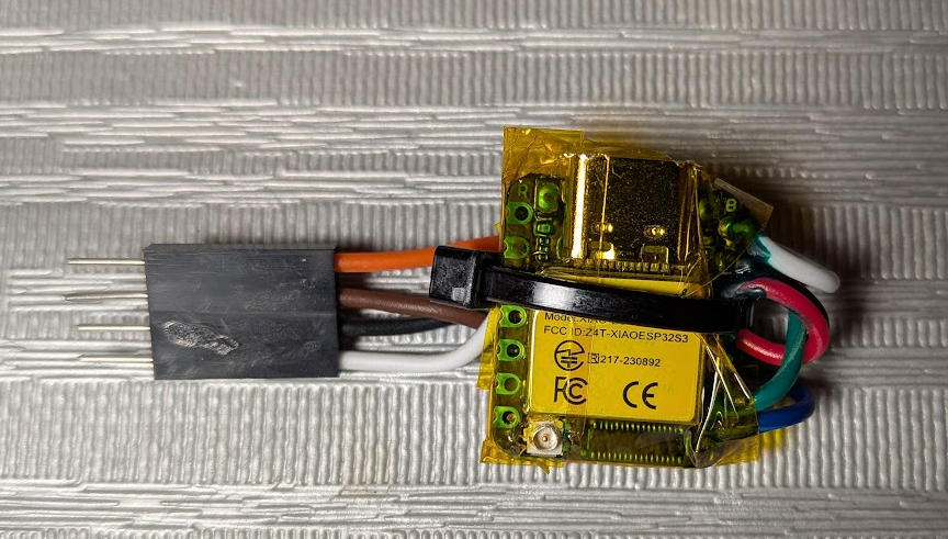 The solution I thought of would solve both my problems. I created a dedicated sniffer based on an ESP32 module, specifically, the XIAO ESP32-S3. Even though I have a plethora of small dev boards, the small form factor of the ESP32 meant that I can hide it in the small gap left between the front panel bezel and the actual door frame, allowing me to button up the front panel. The WiFi capability also meant that I did not need to make holes or have wires coming out of the machine and I could lounge on my couch while watching the dishwasher’s internal communication.