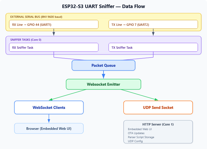 With framing solved, I updated the sniffer firmware to detect packet boundaries in real time, reject corrupted packets, and recover gracefully when it powers on mid-stream.