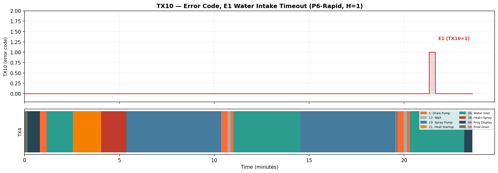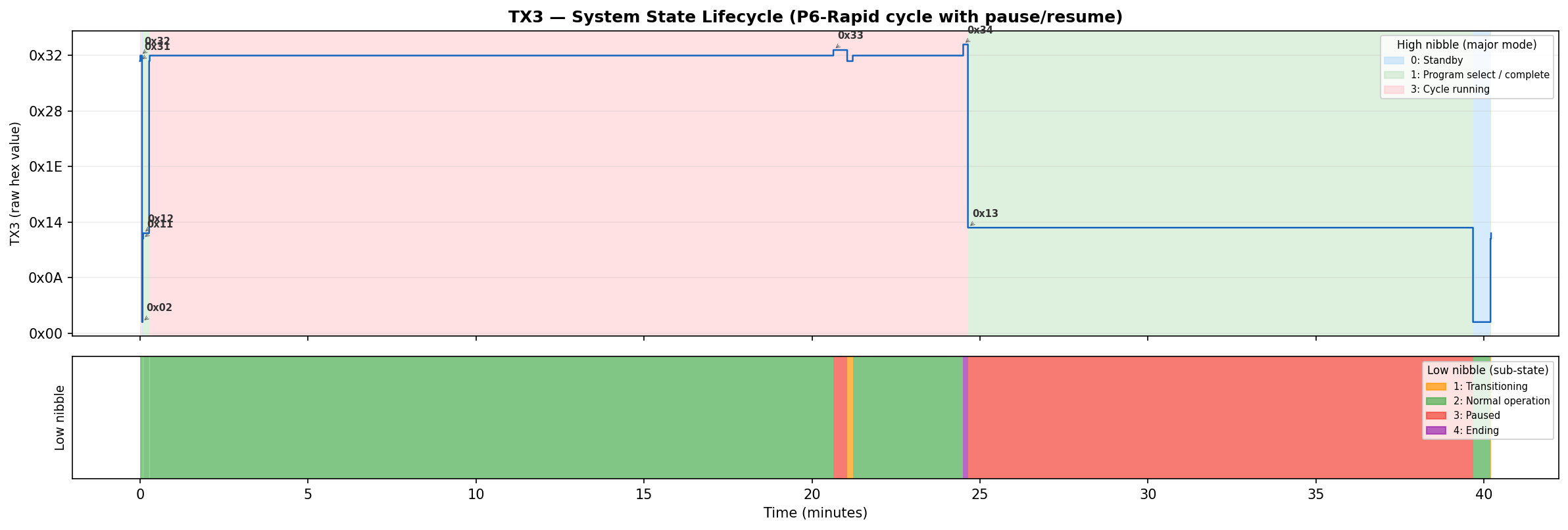 My approach was to log TX3 values during every kind of event I could produce: powering on, starting a cycle, pausing mid-cycle, opening the door, letting a cycle finish, triggering an error, and running in test mode. By mapping TX3 values to these known events, the structure emerged: