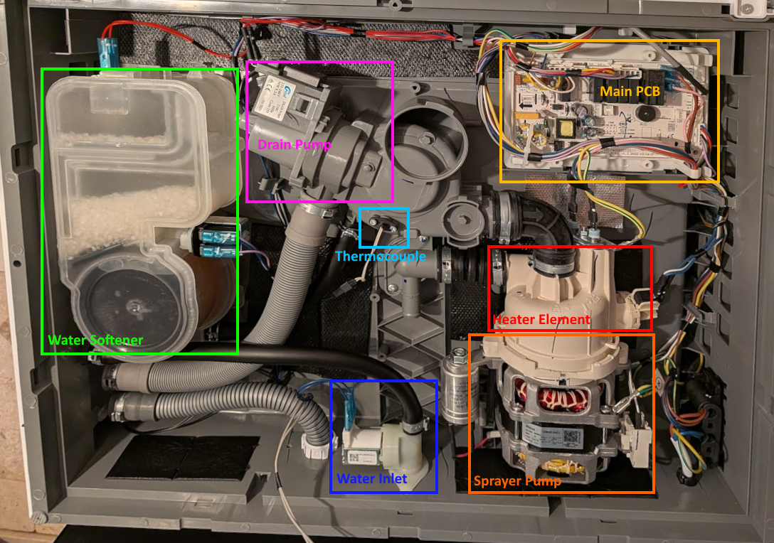 I opened up the machine and inspected the control board. It has printed labels and solder pads for: drain pump, wash pump (high speed), wash pump (low speed), heater, inlet valve, regeneration valve, dispenser, fan, diverter valve, turbidity sensor, lights and more.