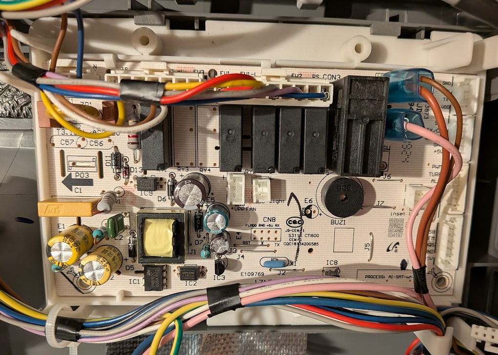 On my counter-top unit, several of these are not connected: the fan, lower-speed wash pump, diverter valve, turbidity sensor, etc. The headers are on the PCB, the traces are there, but no wires lead to them. This board is shared across multiple Midea dishwasher models, and I assume the firmware is probably similar if not identical. This helps me filter out false positives (I know I don’t have a turbidity sensor and therefore a sensor reading fluctuating is probably not turbidity). It also confirmed that some values/states may actually not mean anything or correlate to a visual/audio cue as these would be missing on my unit.