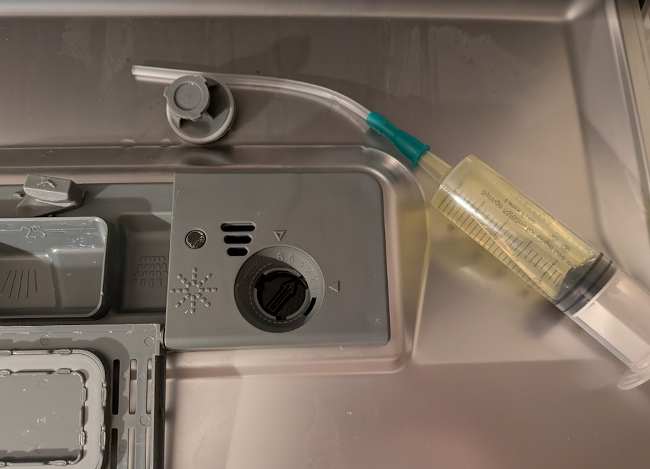 The rinse aid was a bit harder to trigger, There is no easy and clean way to empty the rinse aid tank. I opened the cap and using a large 60cc syringe and a flexible medical feeding tube, I sneaked it into the narrow opening and pumped out my patient’s stomach. At first I could not get the sensor to trigger, it was a while before I noticed that the door needs to be almost shut (in an upright position) for the sensor to trigger, which makes perfect sense that if the door is open, it cannot measure a low level as its operating position is closed. Another discovery was that if I swing the door shut relatively fast, which causes the liquid to slosh, the sensor triggers for a brief moment. This caused TX13 bit 5 to change to 1 whenever it triggered.