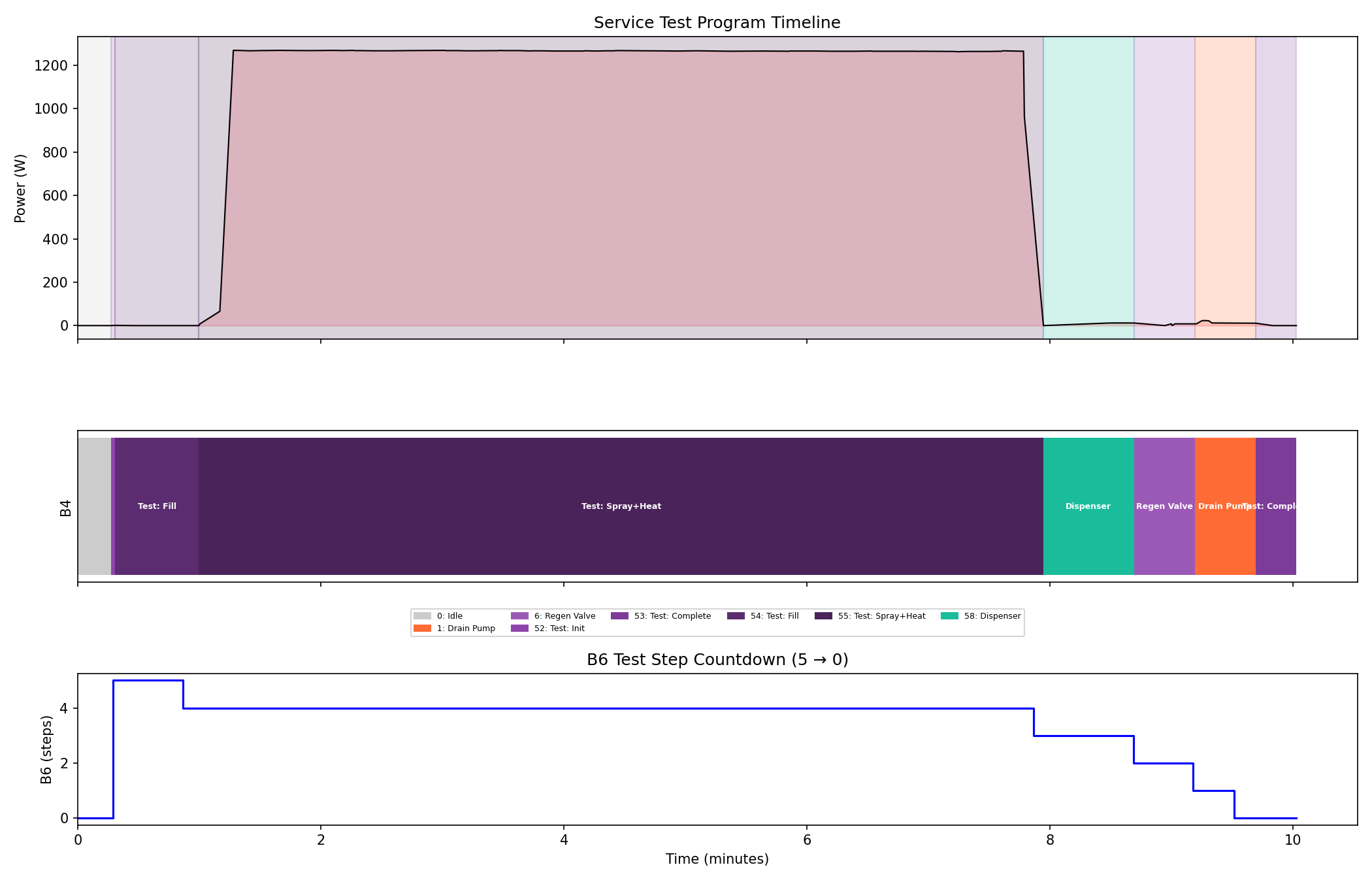To build a complete picture, I waited until I had logged cycles across all programs, when possible I noted anything I could physically observe throughout: what sounds the machine was making, whether I could hear the spray pump or the drain, humming and patterns. I even added just for this byte a power monitor to monitor power for power analysis and correlation.