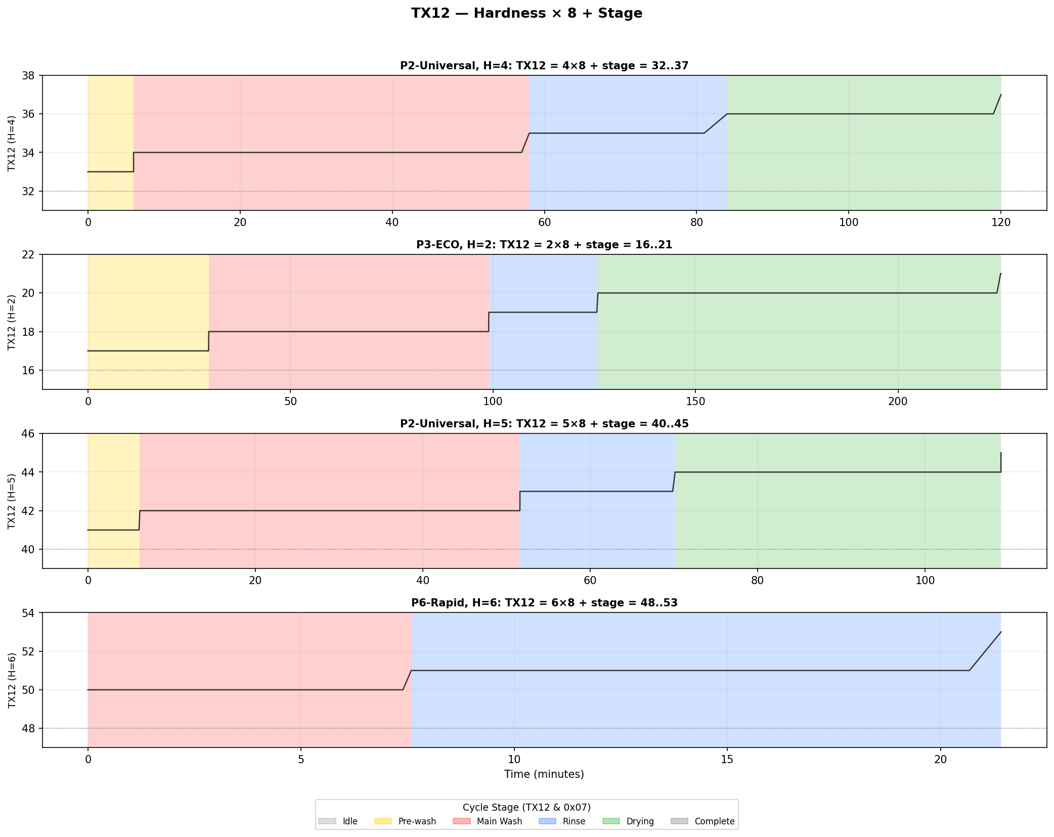 | TX18 | Variable | Some kind of settings digest. Changes with program, timer, extra dry, and hardness selections. Formula unknown. |