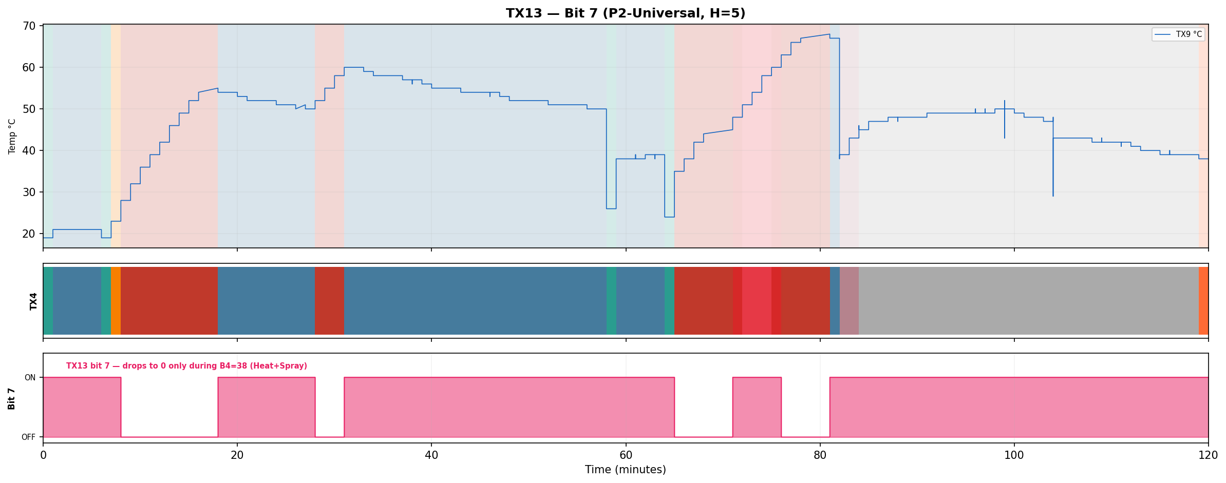 TX13 bit 7. This bit turns OFF during TX4=38 (full-power heating) and during the entire test program, and is ON otherwise. On my single-heater unit, its purpose is unclear. It may control a relay or interlock relevant to models with dual heating elements or additional hardware.