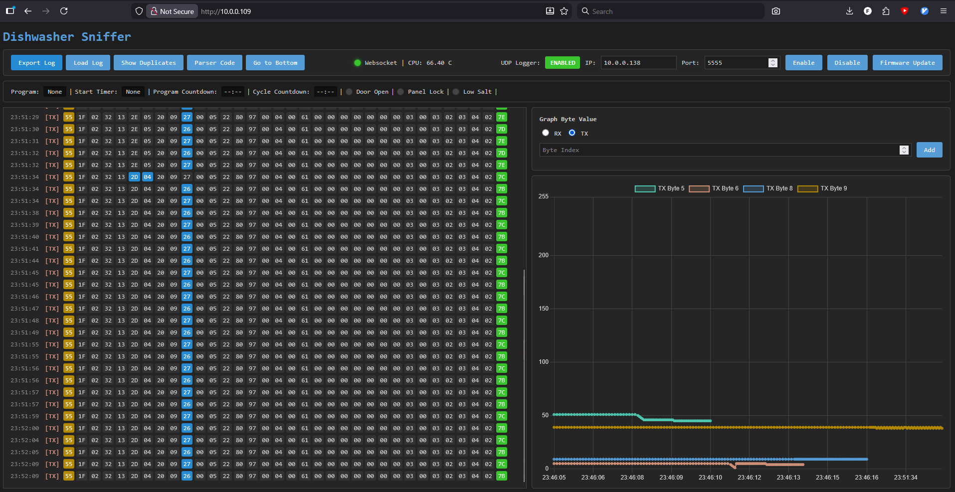 The software setup was also not that complicated. The ESP32 was configured to connect to my local network and just forward those packets over a UDP socket to a static IP address of a container running on my NAS. The container on the NAS just dumped the data into a file that I can access over SMB. Since my NAS is powered on 24/7, I’m passively collecting data as I use the dishwasher and my sample size of packets to analyze grows, all with the benefit of collecting samples from all different types of wash programs, cycles, errors and events, the packets are transmitted at about 10Hz for each direction.